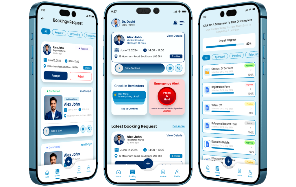 Offer your clients a seamless way to manage their services. With our app, clients can review staff profiles, check qualifications, and schedule bookings, all while keeping track of ongoing jobs in real-time. They can also view and pay invoices directly through the app, eliminating any hassle with billing. It’s designed to give clients control and transparency, allowing them to manage their care services effortlessly.